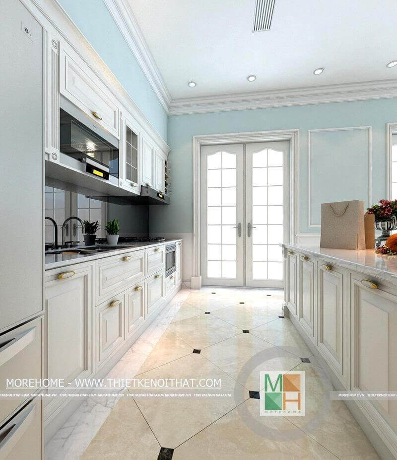 Thiết kế nội thất phòng bếp biệt thự sang trọng với tone màu trắng chủ tạo tạo nên không gian thoáng rộng và đẳng cấp hơn.