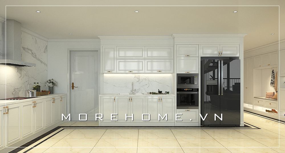 Thiết kế phòng bếp tân cổ điển với nội thất màu trắng tạo không gian sang trọng và rộng thoáng hơn