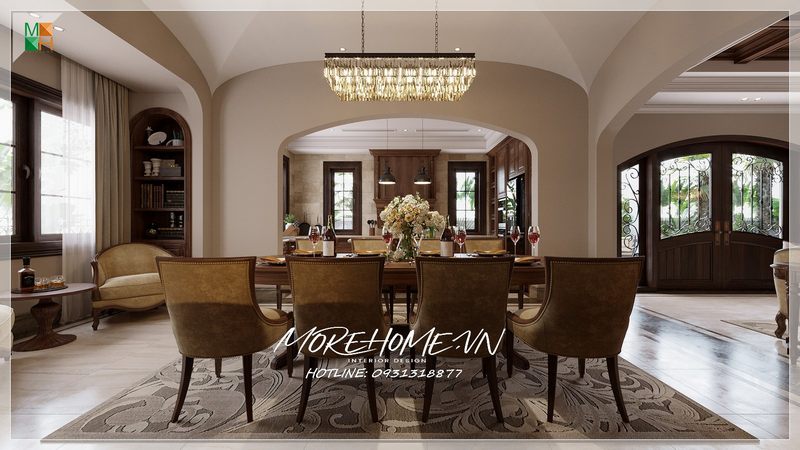 Thiết kế phòng ăn có tủ rượu bằng gỗ óc chó tự nhiên cho phòng ăn biệt thự thêm sang trọng