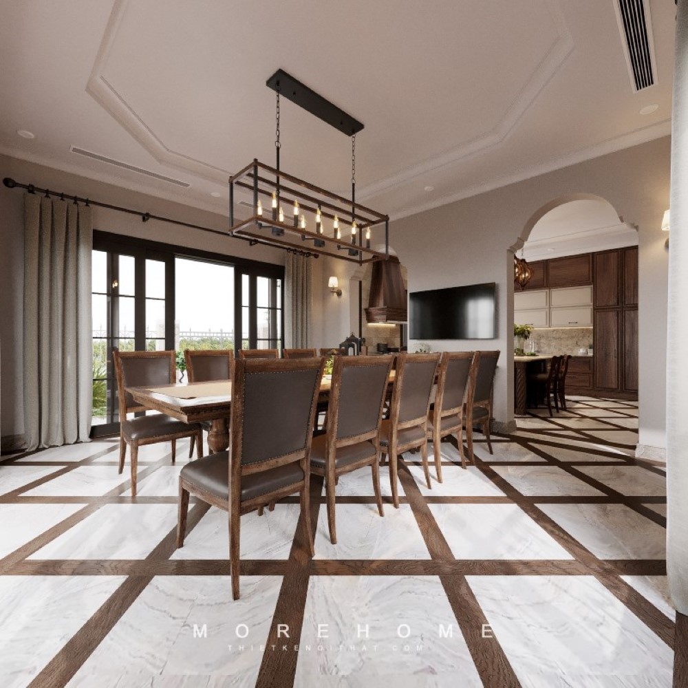 Trang trí phòng ăn từ gạch lát nền hiện đại và đèn thả trần trang trí phòng sang trọng và độc đáo