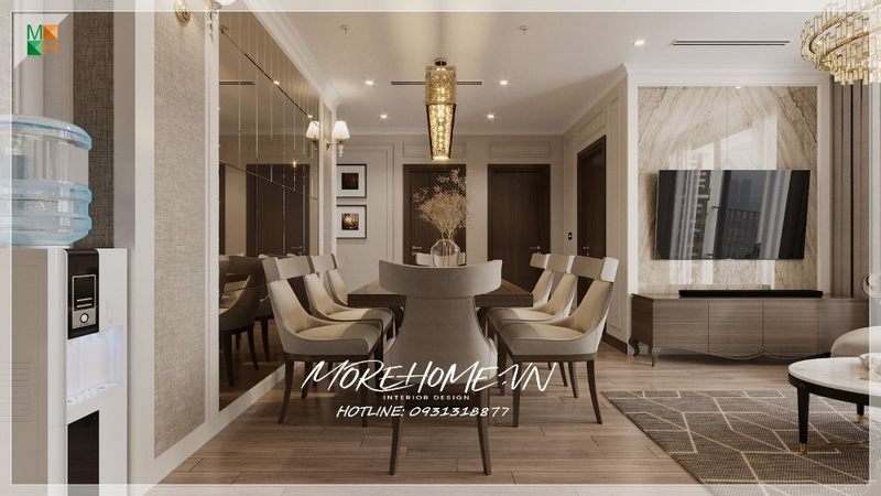 Bộ bàn ăn 8 ghế có tựa độc đáo được đặt ở vị trí trung tâm sắp xếp thích hợp với không gian và nhu cầu sử dụng của gia chủ