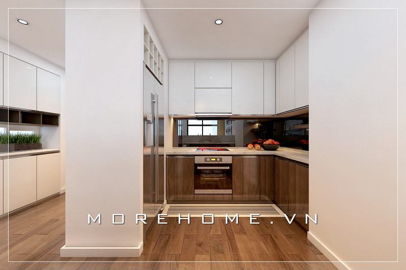 Thiết kế nội thất phòng bếp chung cư đẹp với hệ tủ bếp gỗ tự nhiên màu nâu trầm mang đến vẻ đẹp sang trọng, đẳng cấp cho căn phòng.