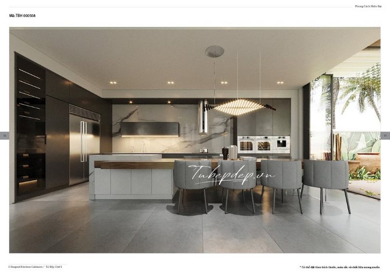 Bạn đang chiêm ngưỡng mẫu thiết kế phòng bếp mang phong cách hiện đại, sử dụng tủ bếp màu xám tinh tế, sạch sẽ.