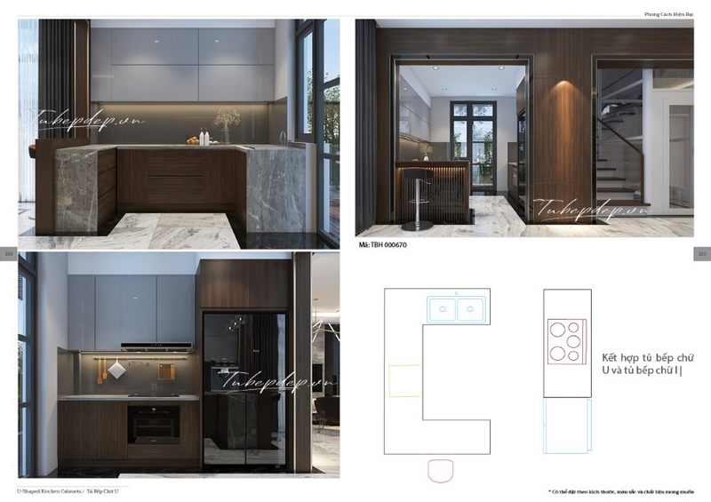 Phòng bếp được thiết kế hình chữ U với nội thất gỗ công nghiệp hiện đại và ấn tượng