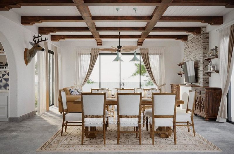 Thiết kế nội thất phòng ăn gỗ tự nhiên kết hợp đèn chiếu sáng, tủ kệ hay các chi tiết nhỏ từ cửa sổ, rèm cửa đều khá ấn tượng mang đến sự hài hòa cho không gian sống.