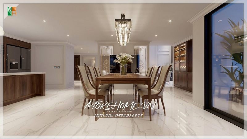 Bố trí nội thất phòng ăn phòng ăn tân cổ điển đẹp, quý phái với không gian bàn ăn dành cho 10 người nhưng vẫn rộng rãi thông thoáng.