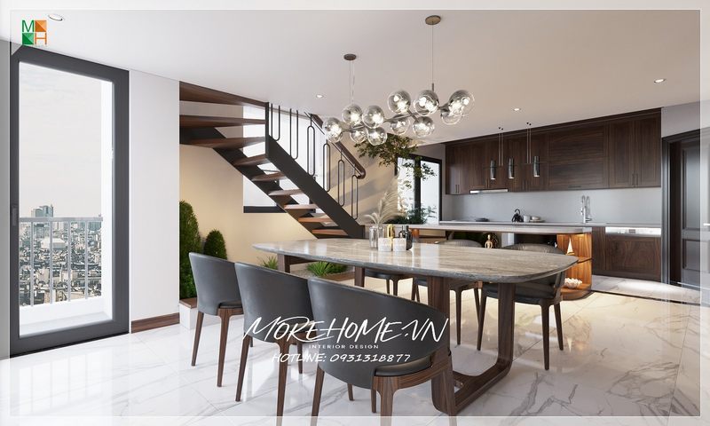 Tận dụng khoảng không gian trống giữa phòng khách và lối vào để đặt một bộ bàn ăn cũng là một phương án hết sức sáng tạo của KTS Morehome, giúp không gian đỡ trống trải và cũng tạo nên bố cục ấm áp cho ngôi nhà của bạn