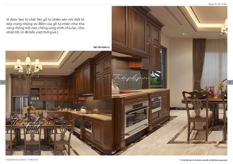 Mẫu thiết kế phòng bếp - bàn ăn tân cổ điển dành cho biệt thự, nhà phố với chất liệu được sử dụng chủ đạo là gỗ tự nhiên đẳng cấp.
