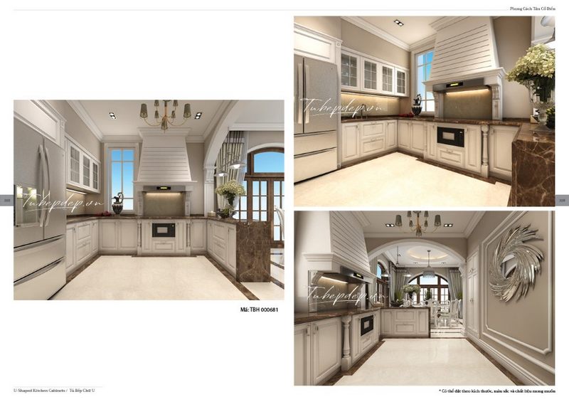 Tủ bếp màu trắng kết hợp với đá nâu là sự hoàn hảo trong không gian phòng bếp của biệt thự, nhà phố.